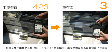 人体に有害とされる紫外線を大幅にカットすることで、室内の窓際の商品・内装材の色あせを防ぎ、さらに室内の蛍光灯などから出る紫外線に集まってくる虫の飛来を軽減し、虫が現象する事で屋外の窓の汚れ(蜘蛛の巣など)が解消されます。